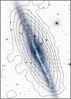 Fig. 1, Left: Edge-on spiral galaxy NGC 891 (total and polarized intensity), observed with the Effelsberg telescope at 8 GHz (3.6 cm wavelength) Optical background image: CFHT/Coelum