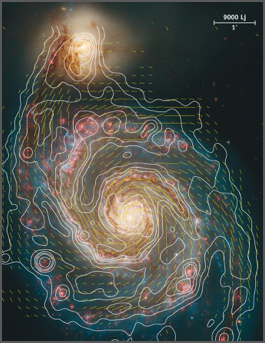 Fig. 2, Right: Spiral galaxy M51 (total and polarized intensity), combined from data observed with the interferometric radio telescope Very Large Array (VLA, USA) and the Effelsberg 100m single-dish radio telescope (Germany) at 5 GHz (6 cm wavelength), Optical background image: Hubble Space Telescope (Hubble Heritage Team)