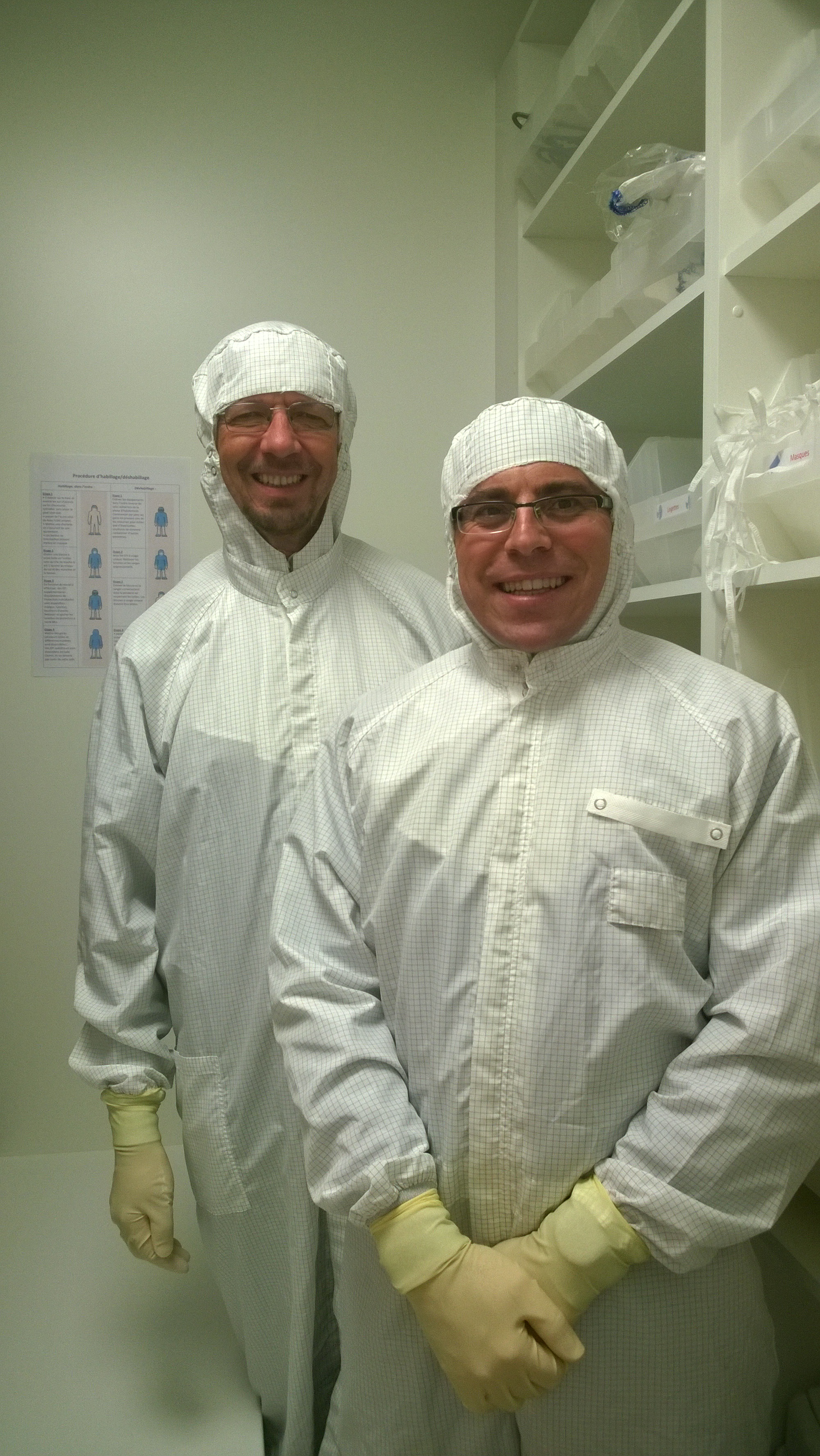 Im Rahmen des PROCOPE-Projektes "CoSi2Me" besuchte Dr. Volker Schulz-von der Gathen den Kooperationspartner Dr. Remi Dussart am GREMI in Orléans, Frankreich. In der Zeit vom 14.-19.09. wurden für gemeinsame Untersuchungen neuartige Arrays präpariert und untersucht. Zum Abschluss wurden Arbeiten des innerhalb der Forschergruppe FOR1123 untersuchten selbst-pulsenden Mikro-Plasmajets im Instituts-Seminar vorgestellt. Das Bild zeigt Volke Schulz-von der Gathen und Remi Dussart beim Übergang in den Reinraum des GREMI zur Präparation der neuen Mikro-Plasmarrays.